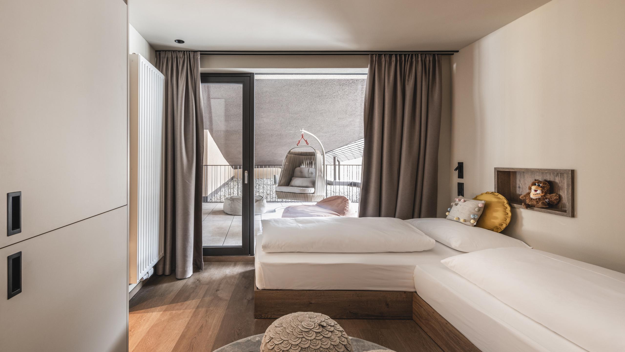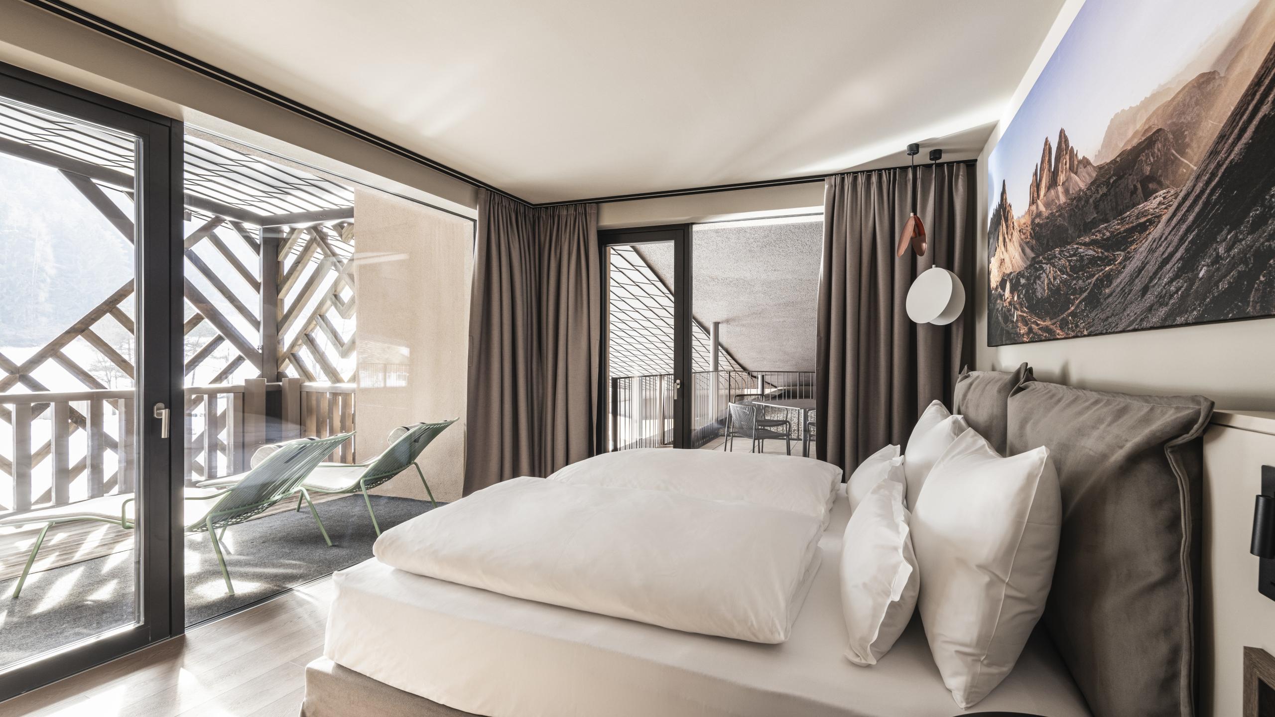 Le Grand Suite di 60 m² con vista lago offrono spazio per 2 adulti e mass. 4 bambini. La suite dispone di 2 camere da letto separate, 2 bagni e un'ampia zona giorno con divano letto. L'ampia terrazza offre una vista unica sul lago naturale dell'hotel. Sono inclusi anche il nostro Lido Exclusive Treatment e un posto auto sotterraneo.