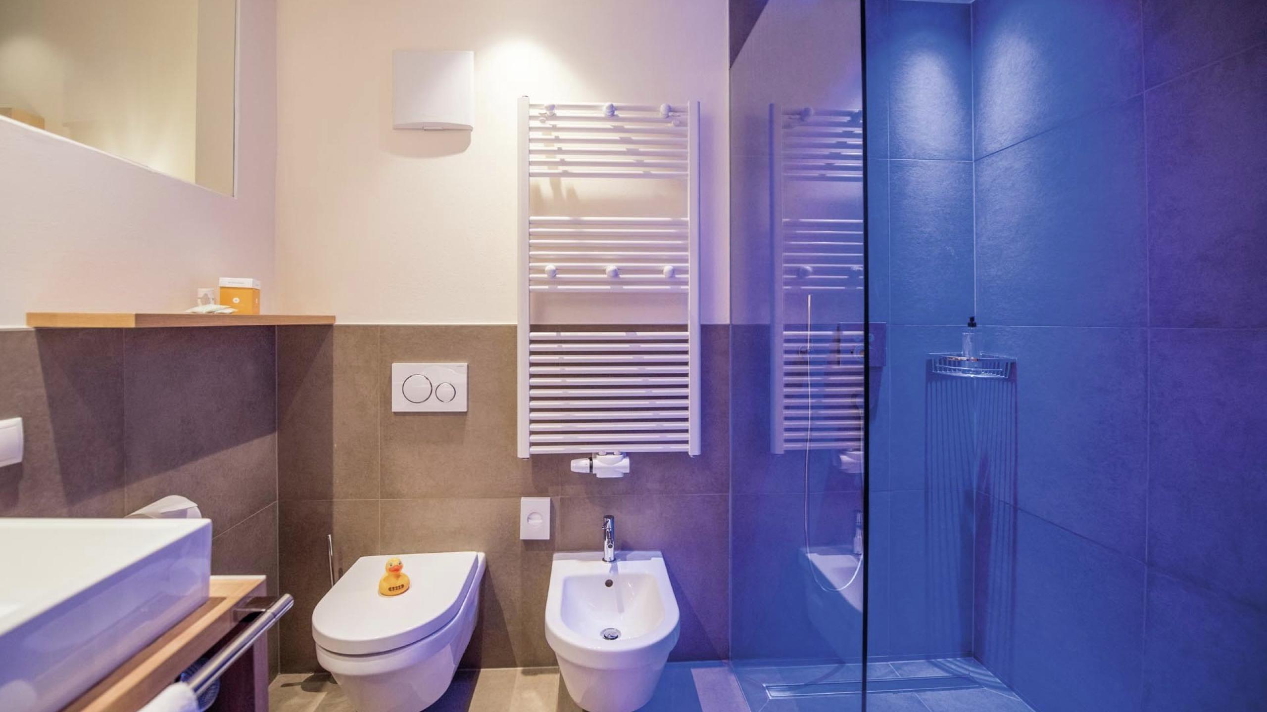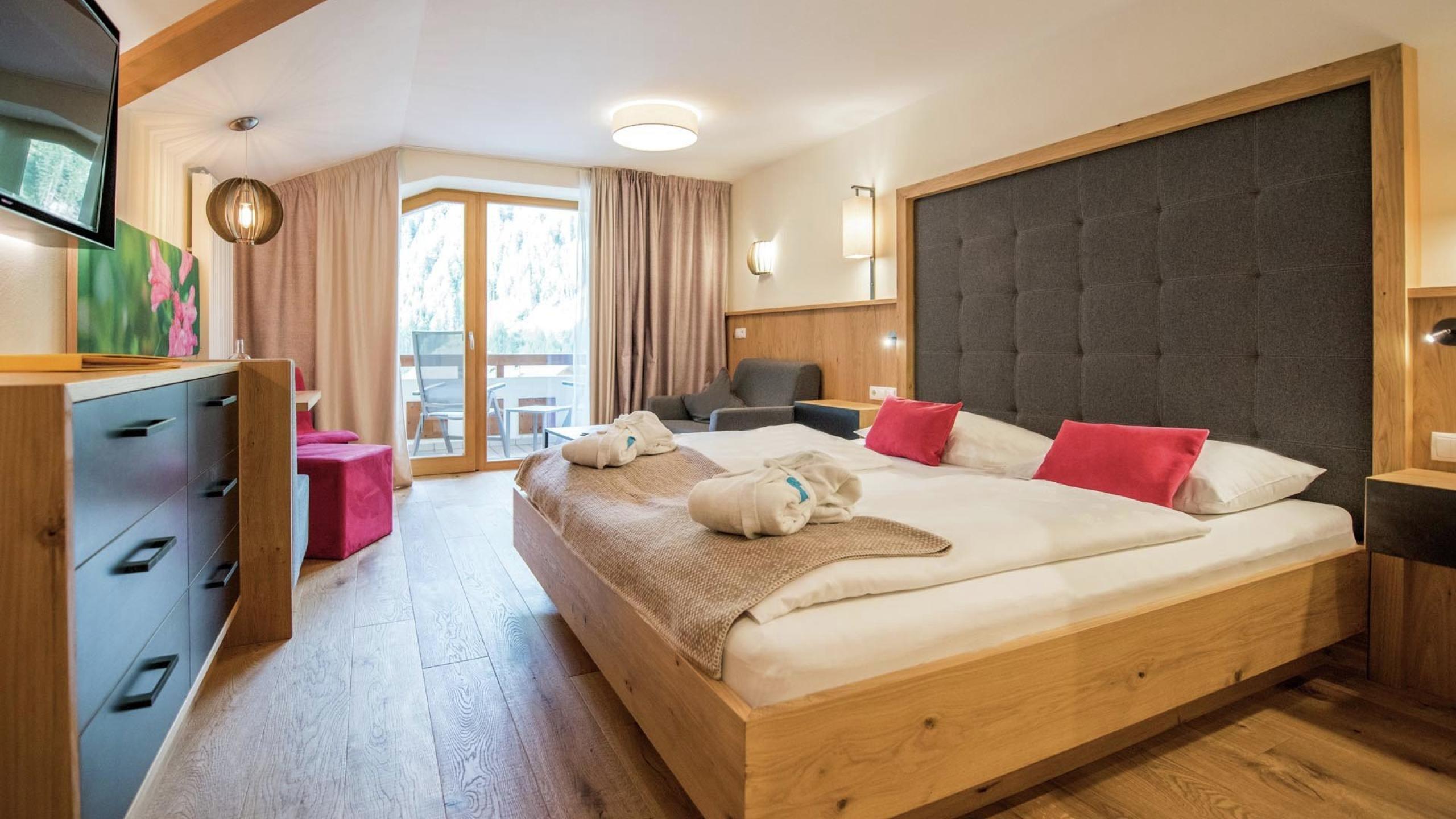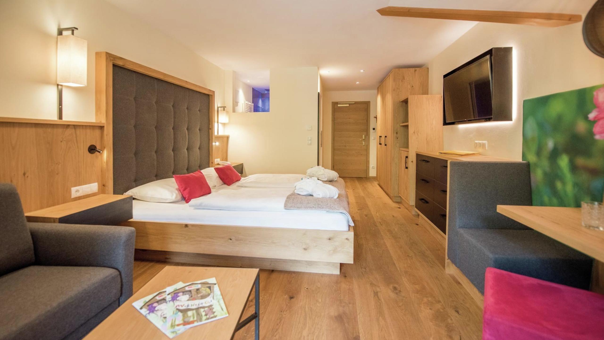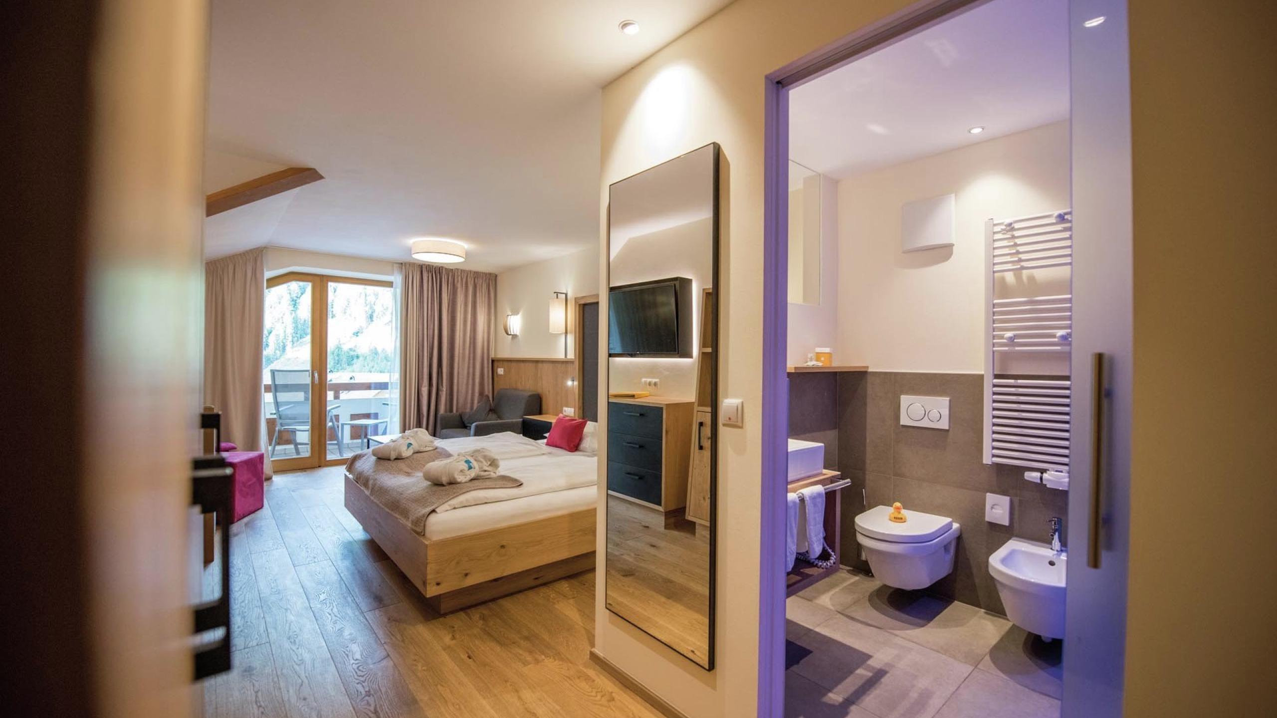 Camera doppia con balcone rivolto a sud di ca. 22 m², con doccia/WC, bidet, TV a schermo piatto, accesso W-LAN, cassetta di sicurezza, asciugacapelli, specchio per la cosmesi, telefono, morbido accappatoio e ciabatte.