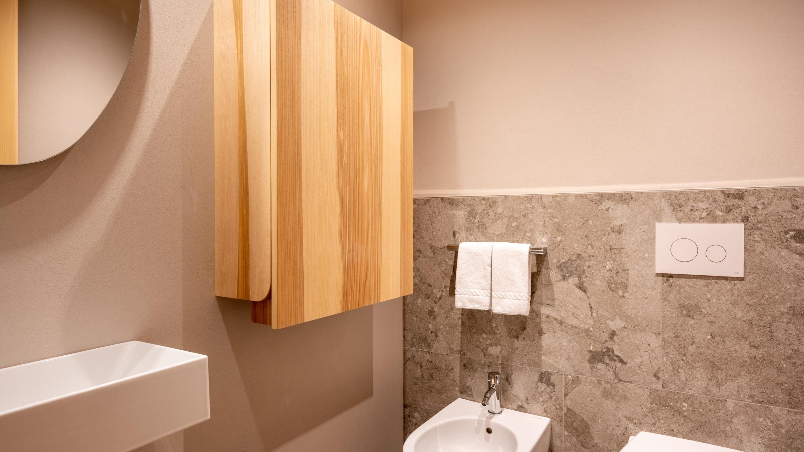 Suite di ca. 45 m² a tre stanze, camera matrimoniale, cameretta con letto singolo o/e a castello, soggiorno separato, pavimento in legno naturale, balcone lato nord, bagno con vasca o doccia emozionale, lavandino per genitori e per bambini, WC separato, bidet, fasciatoio, TV a schermo piatto, accesso WLAN, cassaforte, asciugacapelli, specchio per la cosmesi, fon, telefono con babyphone incorporato, bollitore d'acqua, mini frigo, morbido accappatoio, zaino a noleggio, posto macchina in garage, aria condizionata