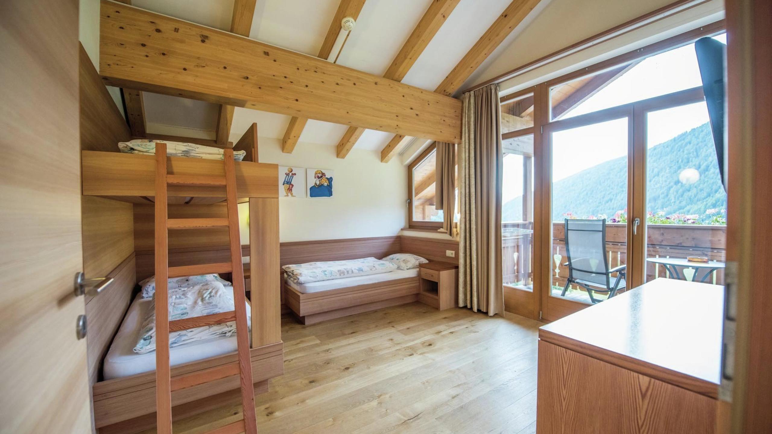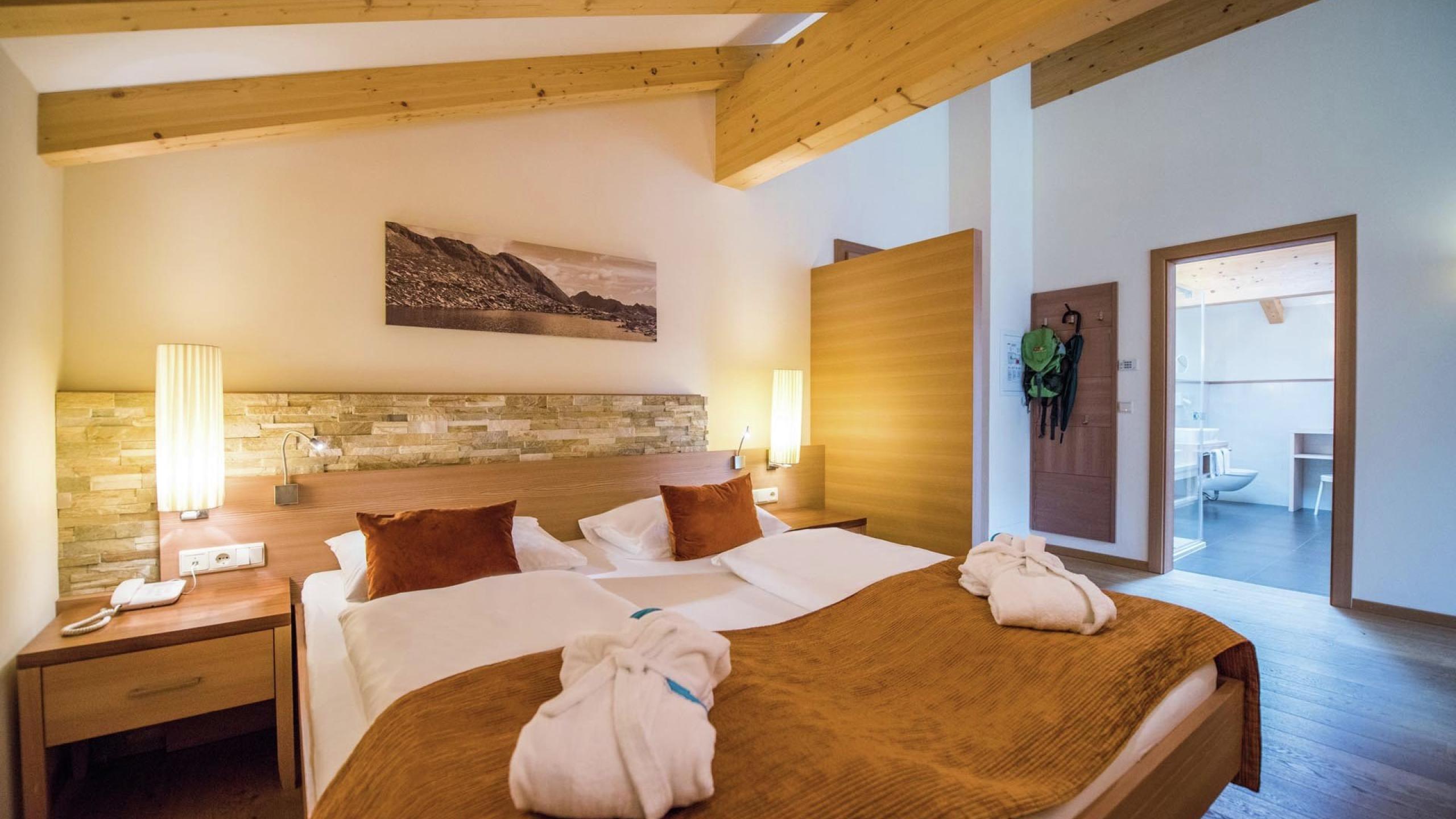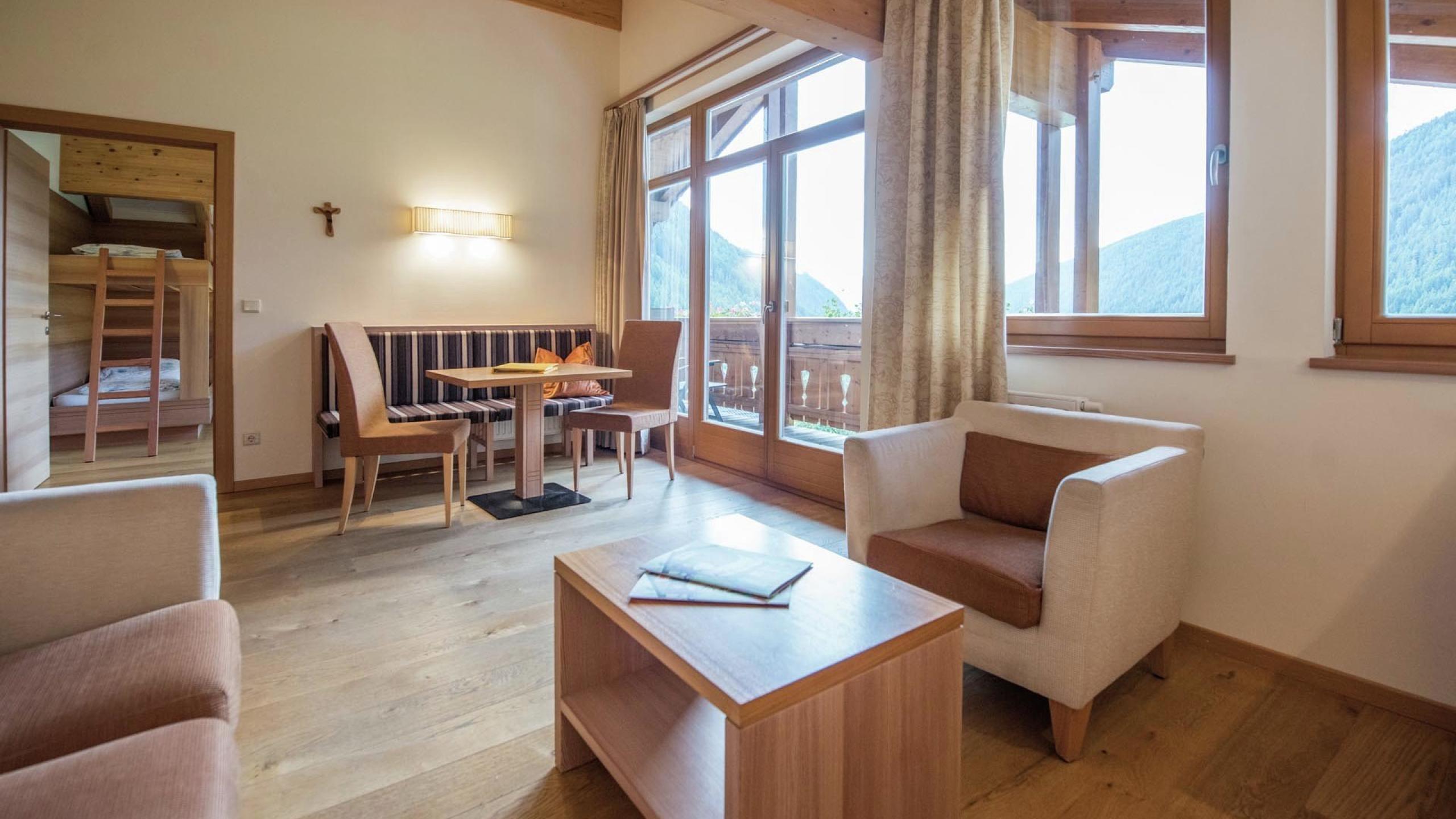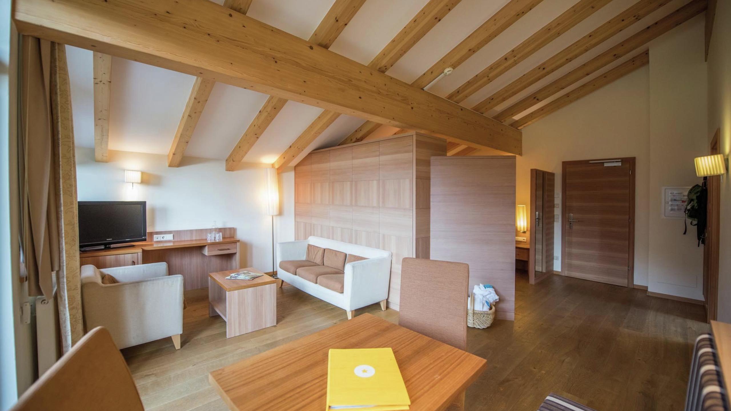 Suite esclusiva di 60 m² con zona giorno, orientata verso sud, con una facciata in vetro e vista sulle Dolomiti, pavimento in legno naturale, bagno spazioso con vasca o doccia, lavandino per genitori e per bambini, WC, bidet, stanza separata per i bambini, TV a schermo piatto, accesso W-LAN, specchio per le cosmesi, asciugacapelli, frigorifero, morbido accappatoio.