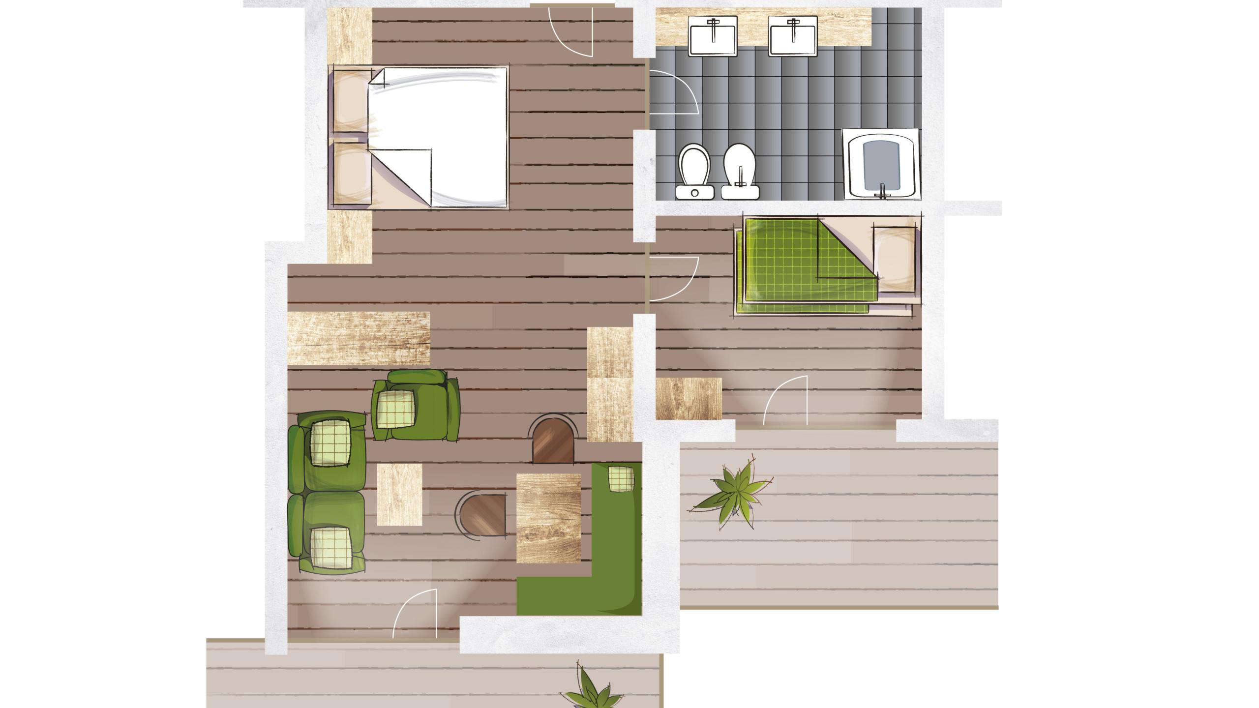 Appartamento di 2 camere con area soggiorno, pavimento in legno naturale, 1 bagno con doccia, WC, bidet, 2 TV a schermo piatto, accesso W-LAN, specchio per la cosmesi, asciugacapelli, frigorifero, accappatoio morbido.