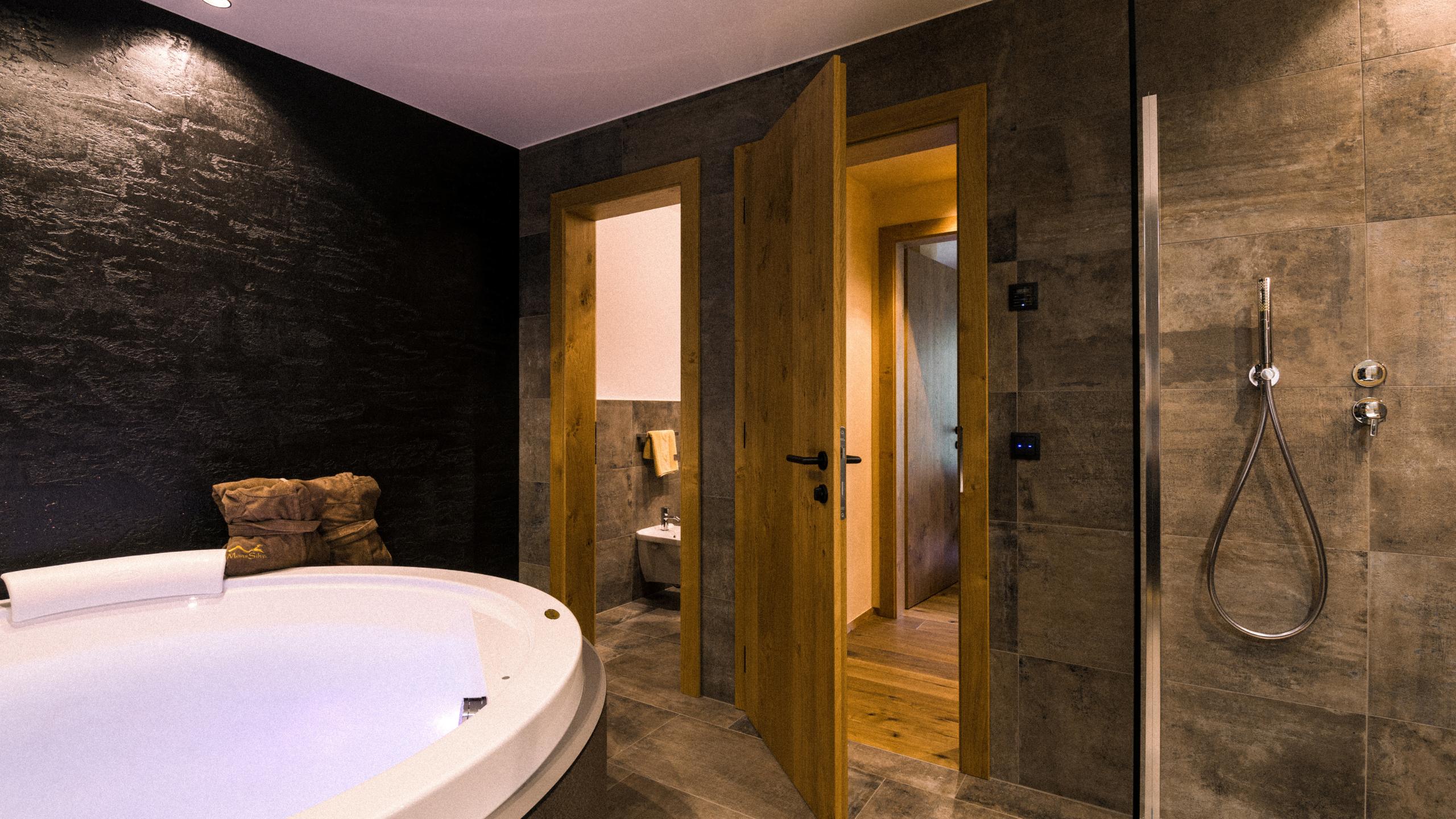 Zona notte e zona giorno confortevoli con divano, pavimenti in legno, stufa tipica a legna, letti di eccellente qualità, TV satellitare, cabina armadio. Bagno separato, vasca idromassaggio, doccia con soffione a pioggia, lavabo doppio. Toilette e bidet in zona separata. Camera separata con letto a castello e letto matrimoniale, TV satellitare, scrivania e bagno privato con WC, doccia con soffione a pioggia, lavabo doppio con lavabo altezza bimbo. Sauna finlandese e hot tub sulla terrazza. La cucina è completamente attrezzata con cantinetta vini, frigorifero, piano cottura, microonde, forno ad aria calda e accogliente zona pranzo, il tutto integrato nella zona giorno.