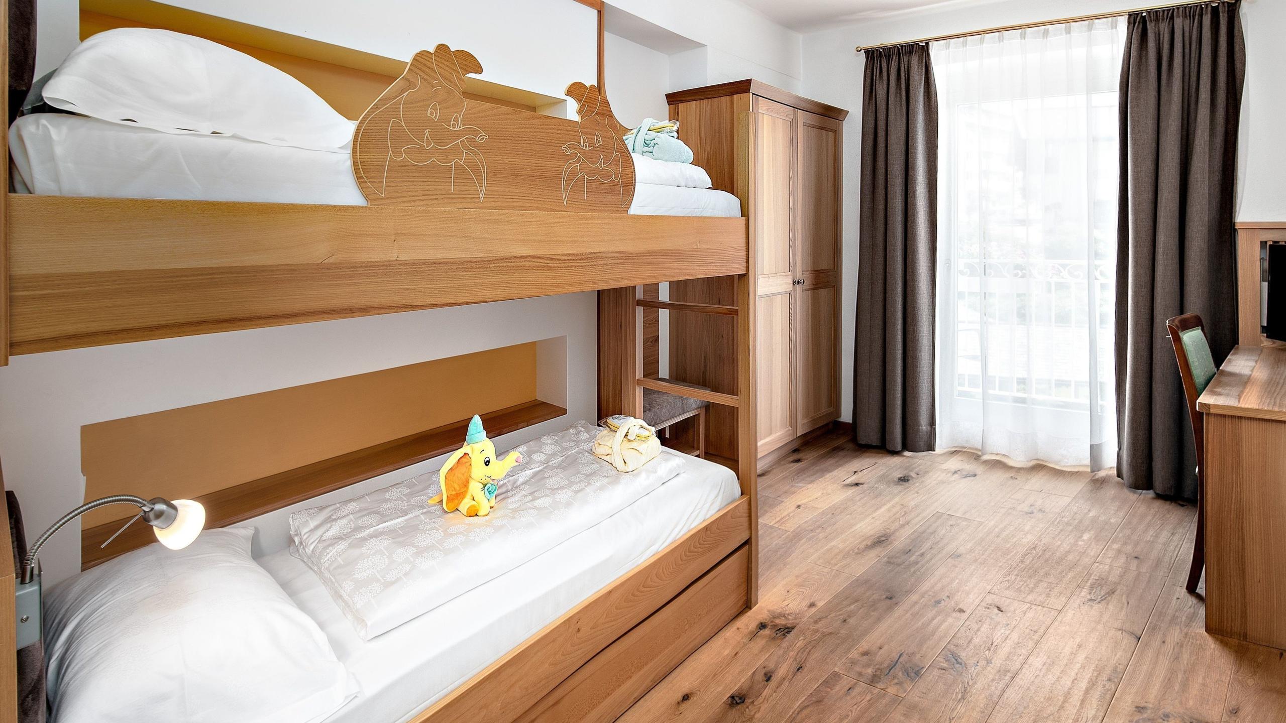 Suite con letto matrimoniale, 2 balconi con vista sul giardino, camera comunicante con due letti singoli o letto a castello e 2 bagni. La praticità incontra l’eleganza.