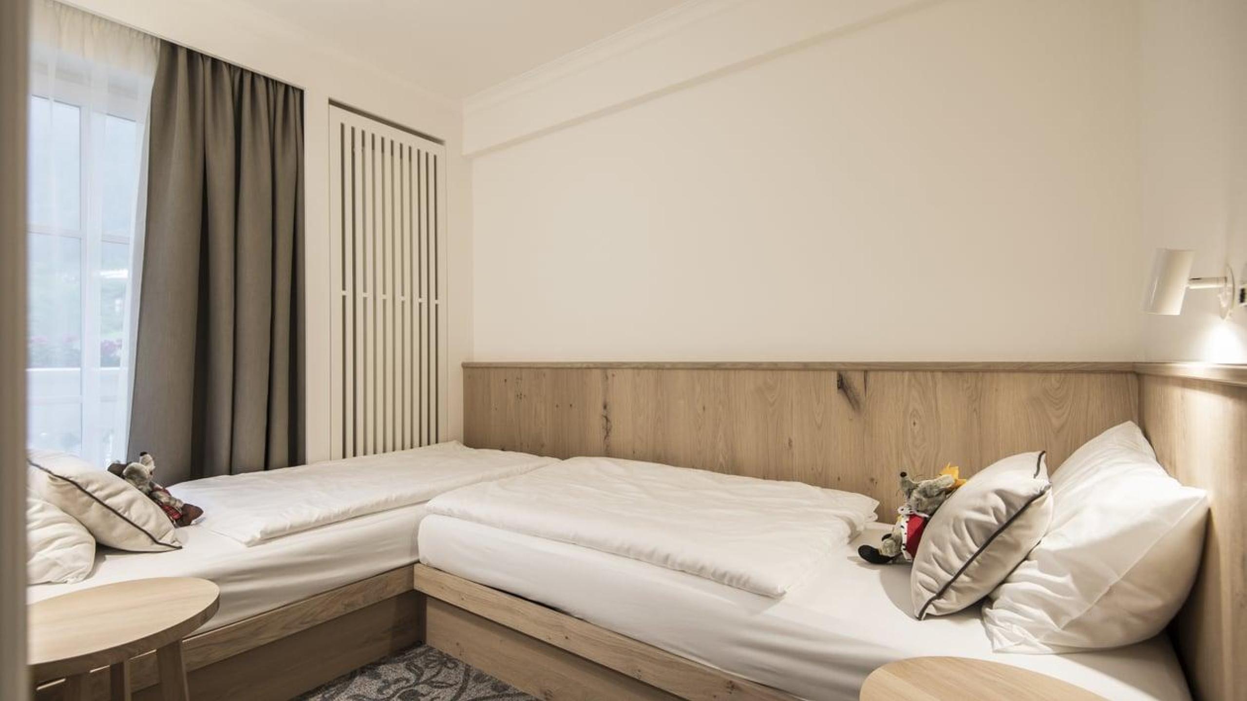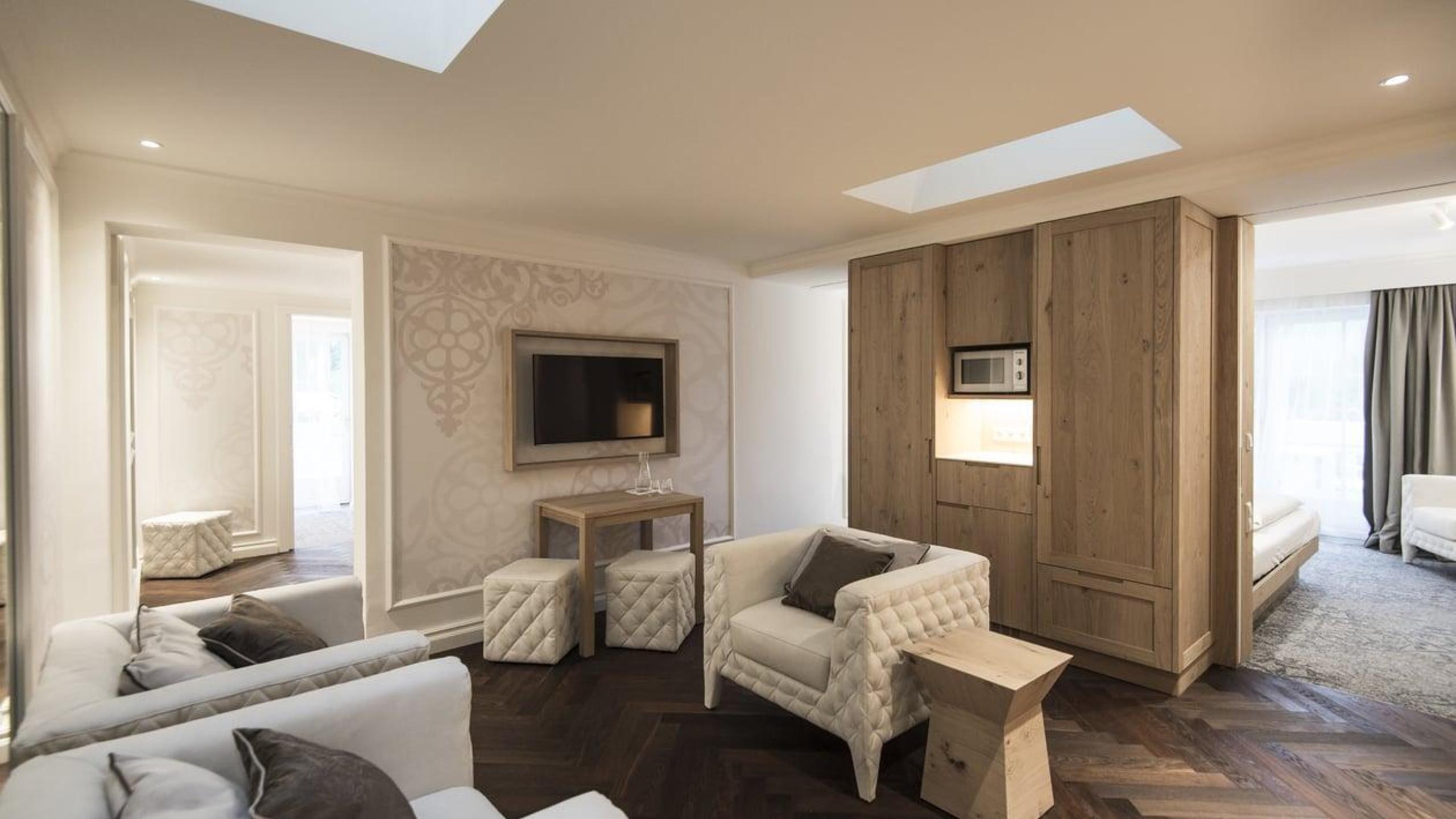 Camera da letto matrimoniale e bagno con doccia, lavabo, WC e bidet. Ampia zona living, camera con 2 letti o culle separati con possibilità di letto supplementare a castello/ribalta + camera singola. Bagno con vasca, bagnetto bebè con fasciatoio, WC e lavabo per bambini. WiFi, 4 TV, cassaforte, pantry con bollitore, forno a microonde, frigorifero, stoviglie e posate. 2 balconi lato sud-est e sud-ovest entrambi lato valle. Climatizzazione e umidificazione dell’ambiente regolabile.
