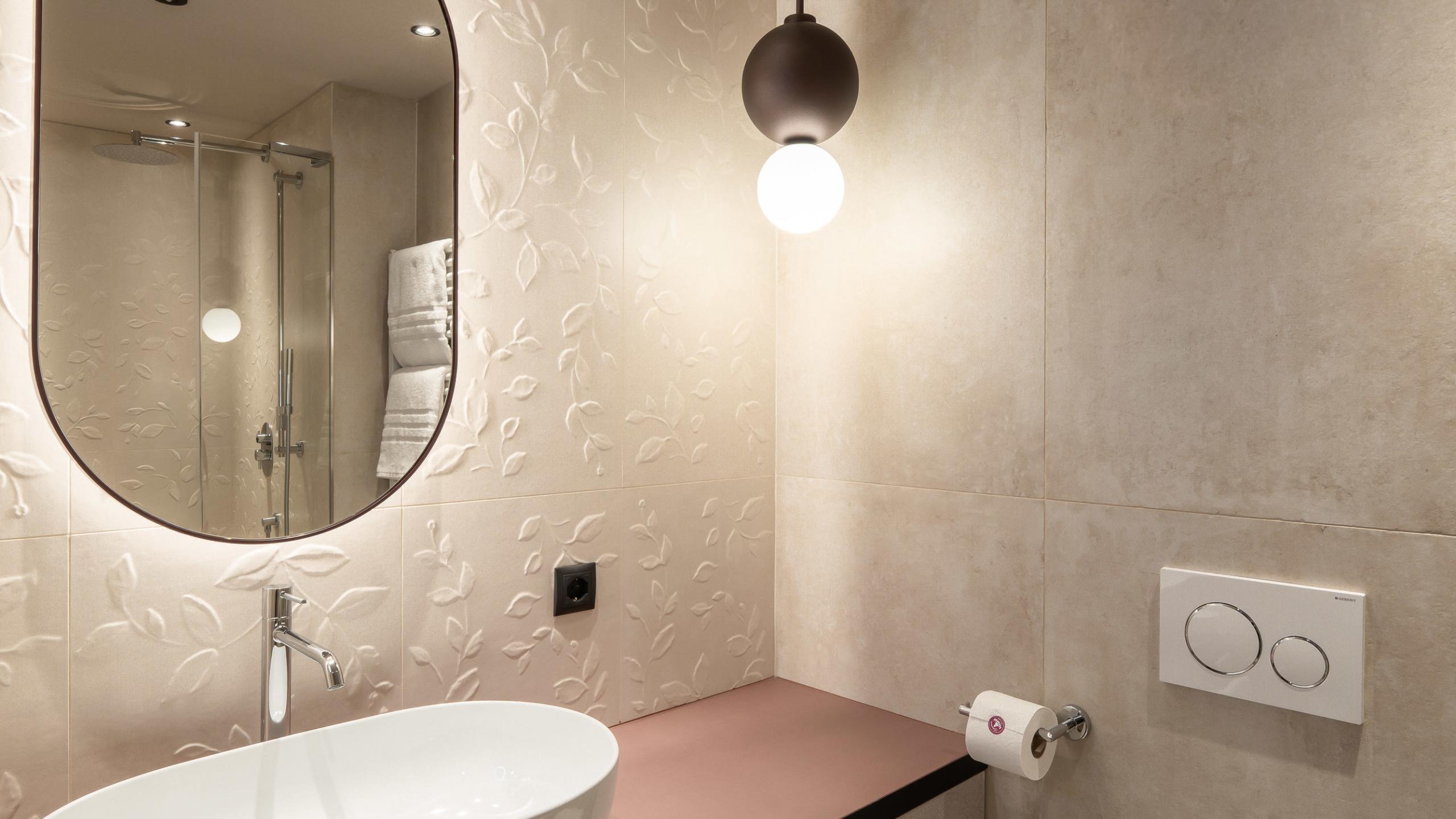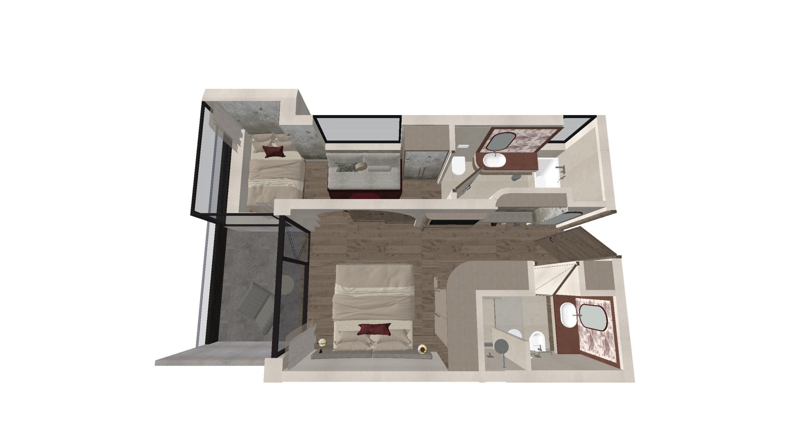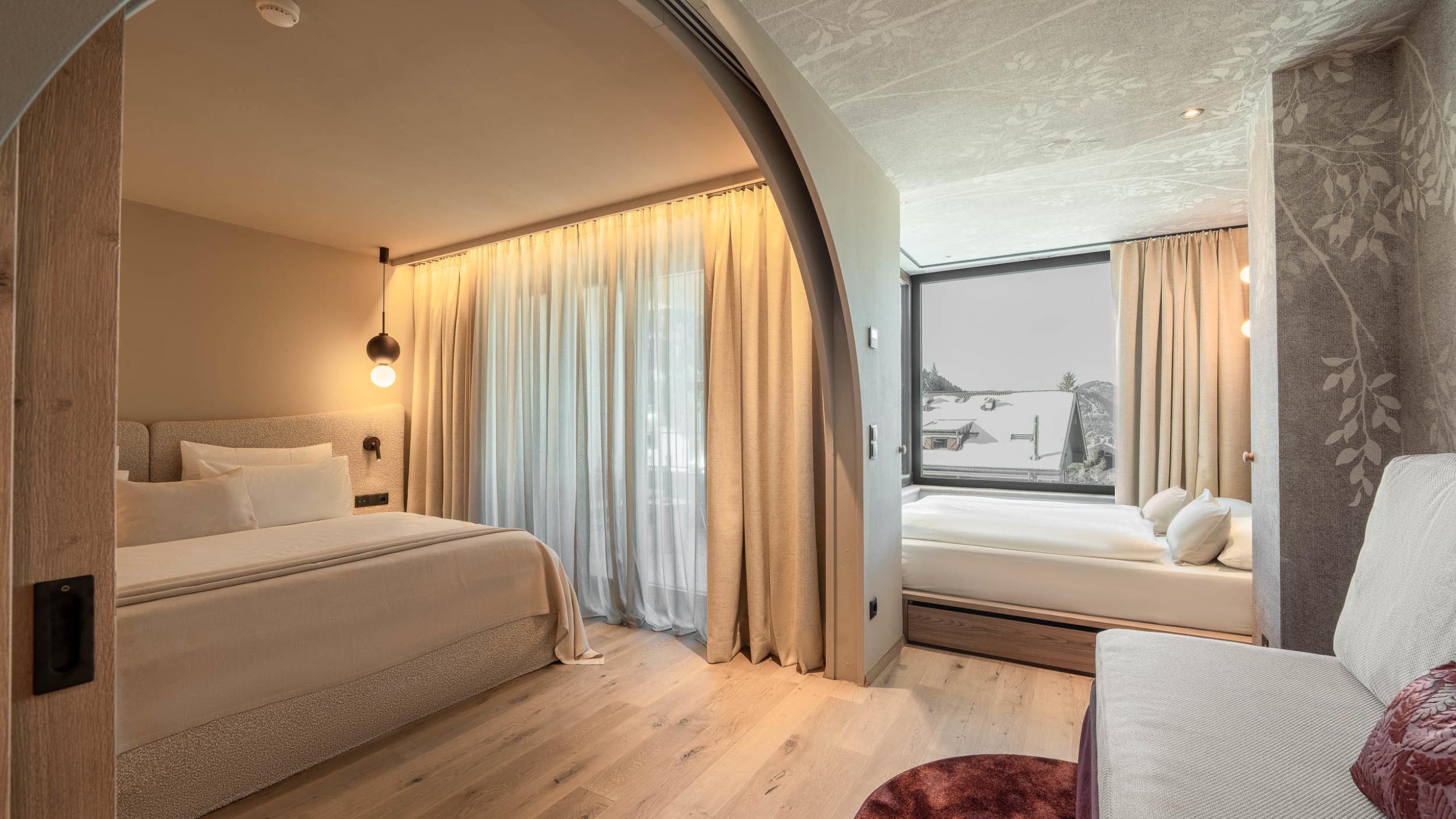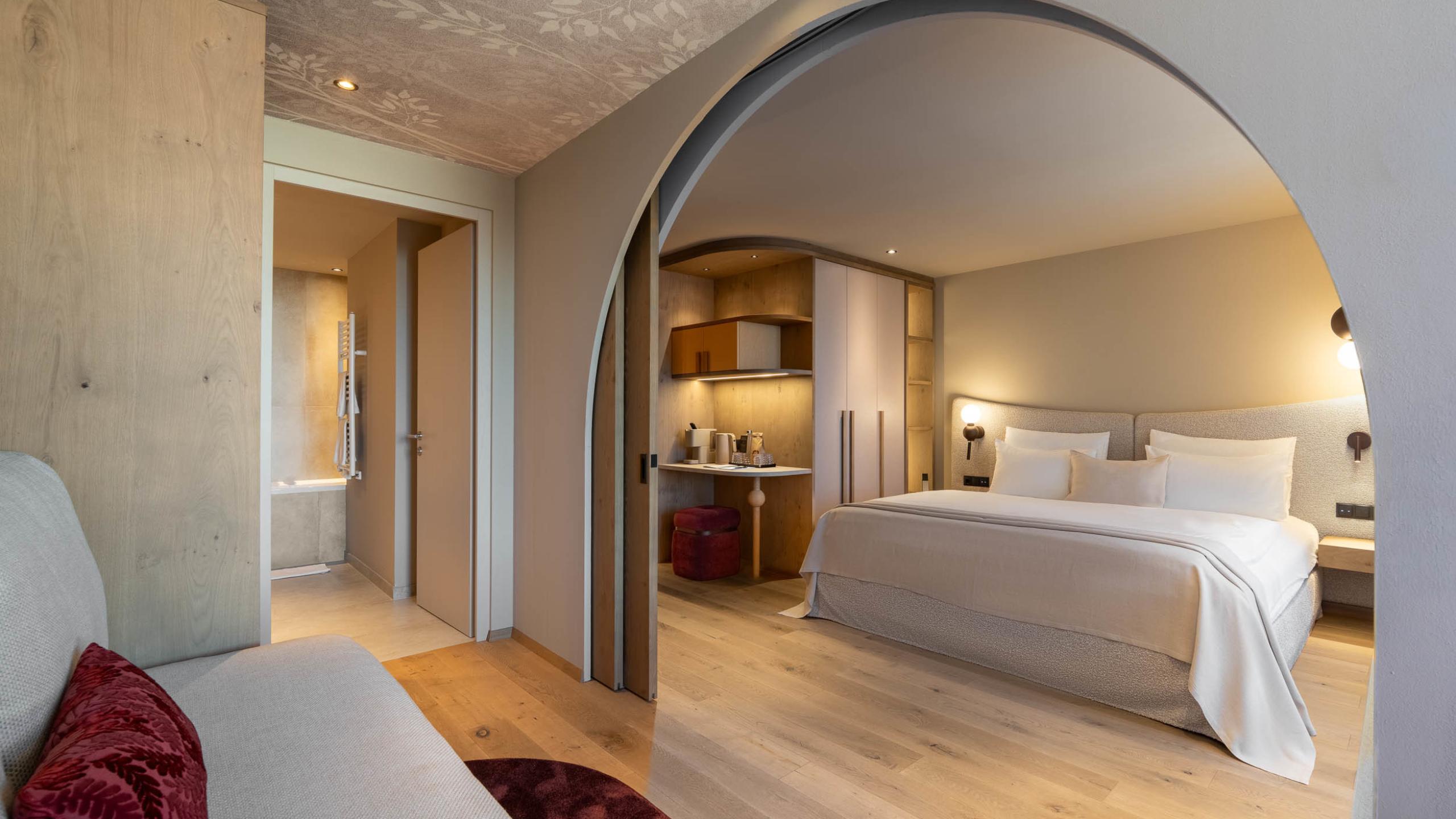 Suite su 43 m² con vista panoramica e balcone. Comprende la camera con letto matrimoniale, separabile da una porta scorrevole da un ambiente con letto singolo e nido panoramico con letto alla francese, TV-sat. Dispone di 2 bagni, entrambi con WC, lavandino, specchio cosmetico, asciugacapelli e set di cortesia. Un bagno è provvisto di vasca ed il secondo bagno di doccia e bidet.