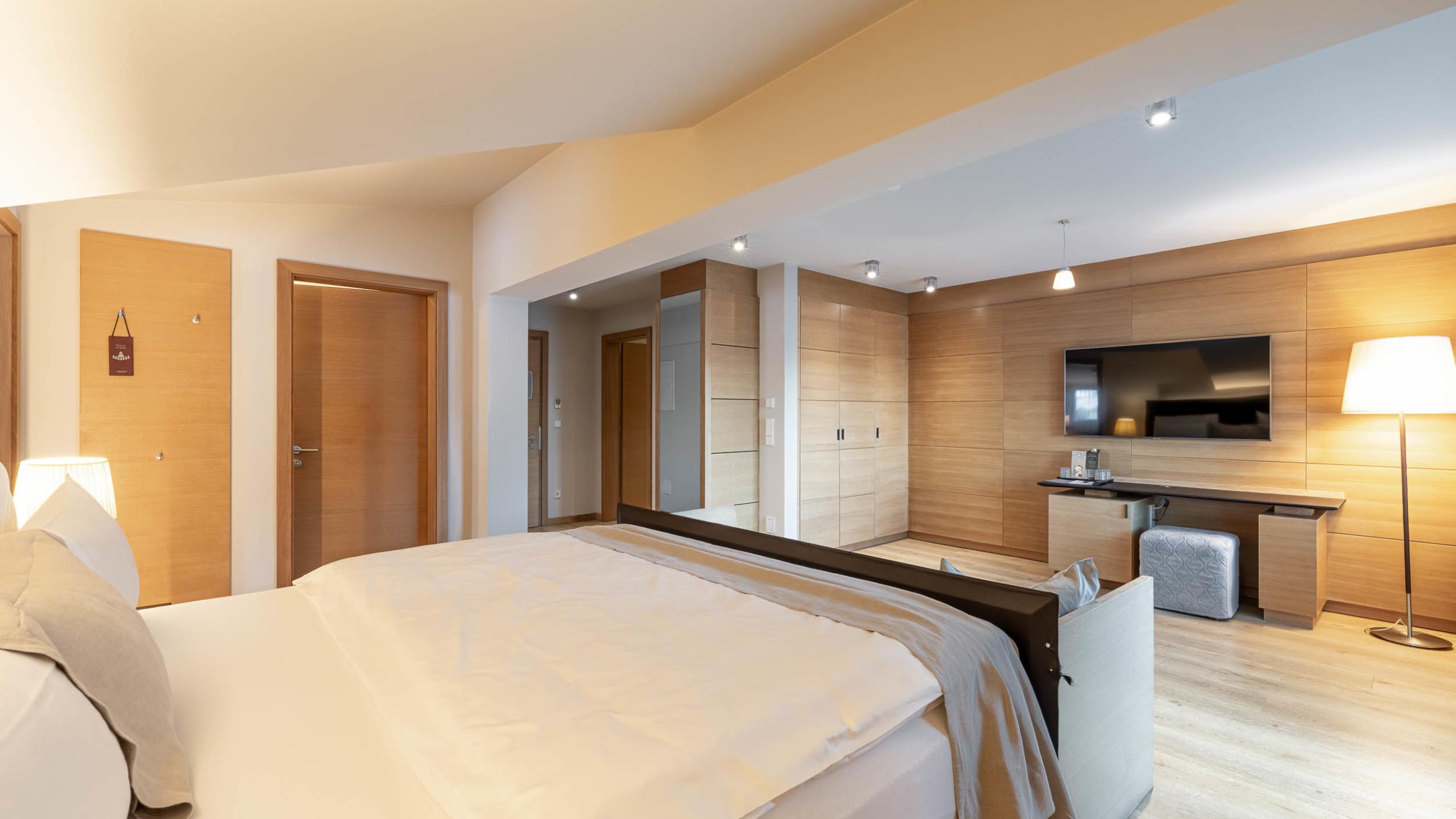 La camera dispone di due bagni: un bagno con vasca e WC, l'altro con doccia, WC e bidet separati, asciugacapelli e specchio cosmetico