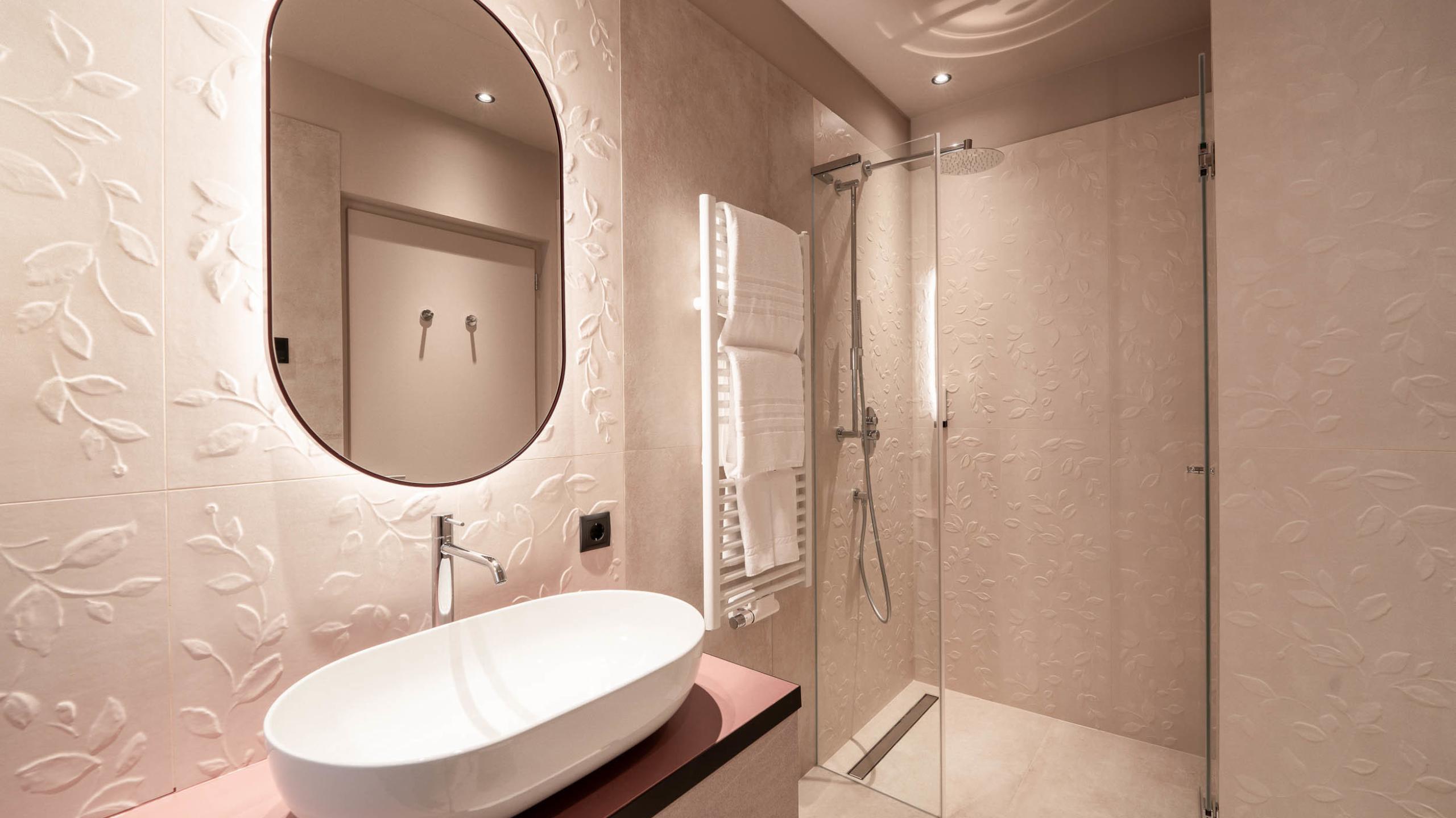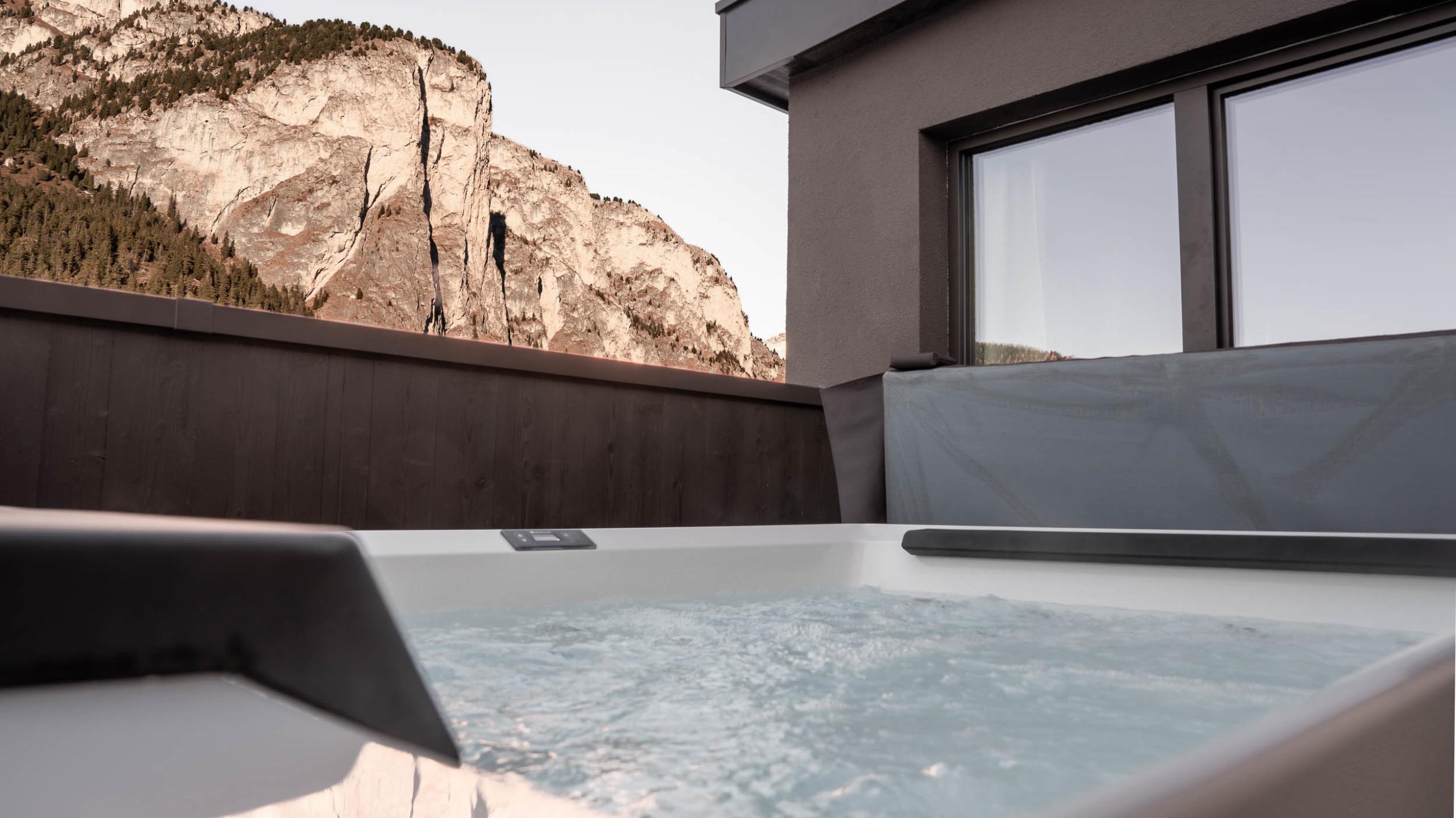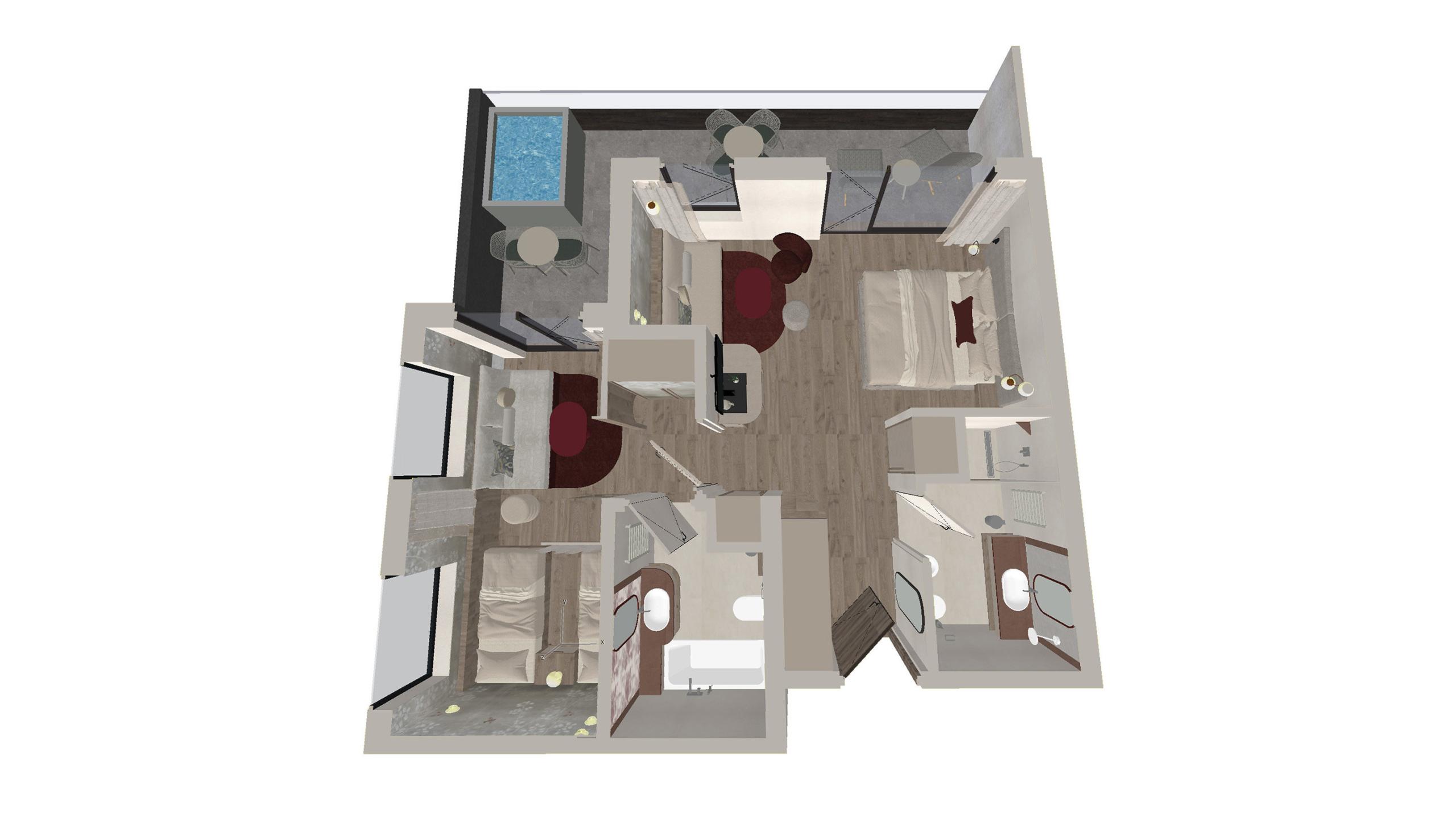 Suite su 60 m² con eccezionale vista panoramica e balcone. Comprende l'entrata, la spaziosa camera matrimoniale con divanoletto/angolo soggiorno e la spaziosa camera separata bimbi con due letti singoli e divanoletto, 3 TV-sat. Dispone di 2 bagni, entrambi con WC, lavandino, specchio cosmetico, asciugacapelli e set di cortesia. Un bagno è provvisto di vasca ed il secondo bagno di doccia e bidet. Il balcone è provvisto di vasca idromassaggio panoramico (orario tra le ore 8:30 e 20:00).