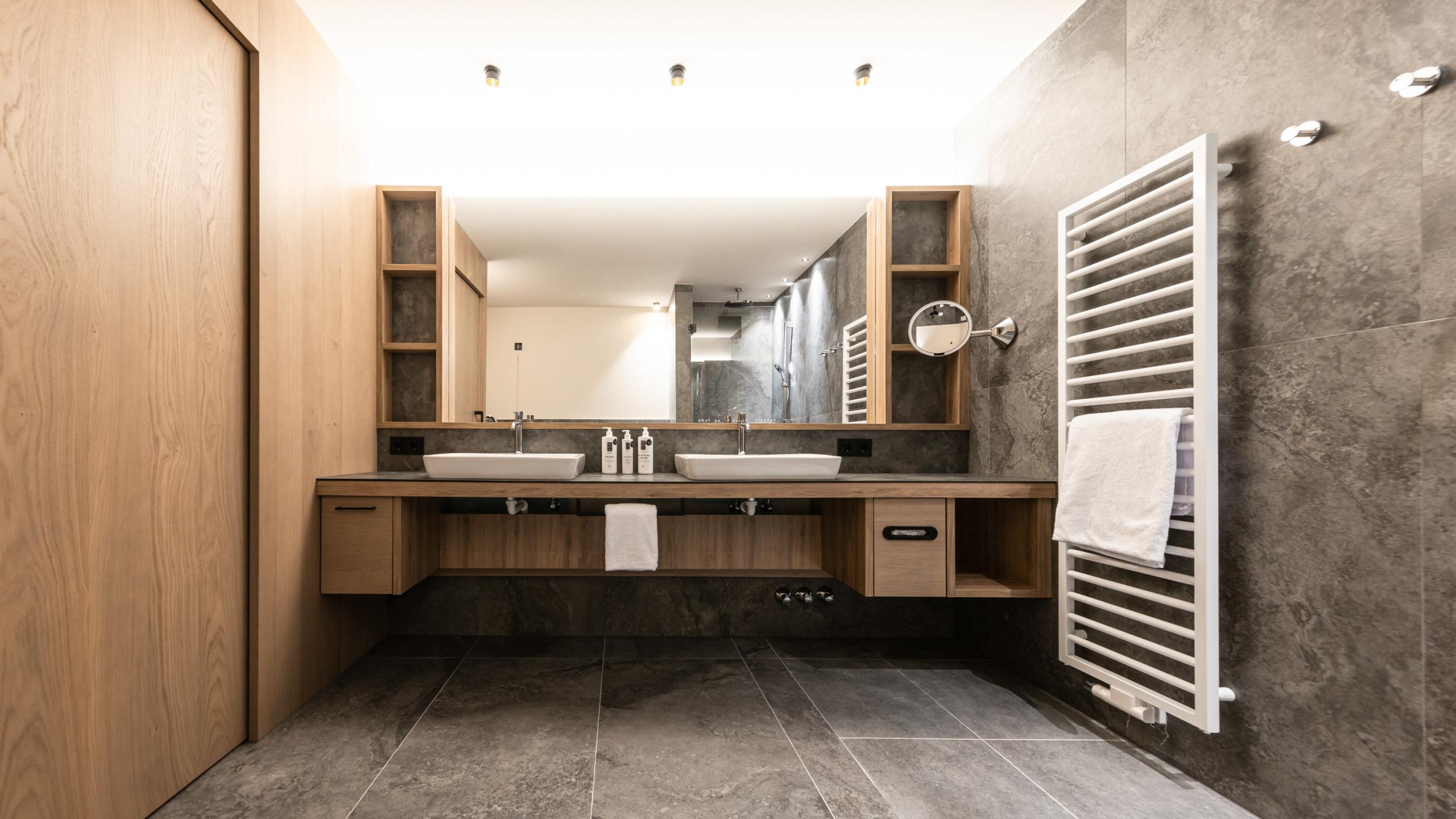 • Bagno con doccia a pioggia, doppio lavabo, WC parzialmente separato e bidet
