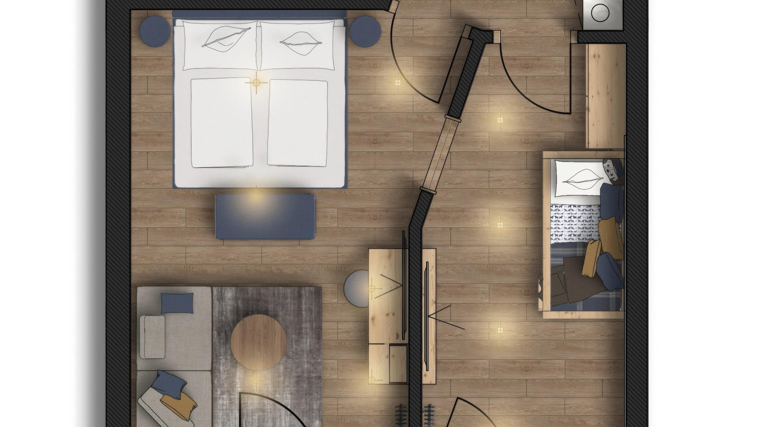 Camere per respirare a fondo: zone giorno soleggiate con terrazza privata, vista sul Lago di Resia, camera per bambini separata e divano letto per tutti coloro che apprezzano la flessibilità in vacanza.