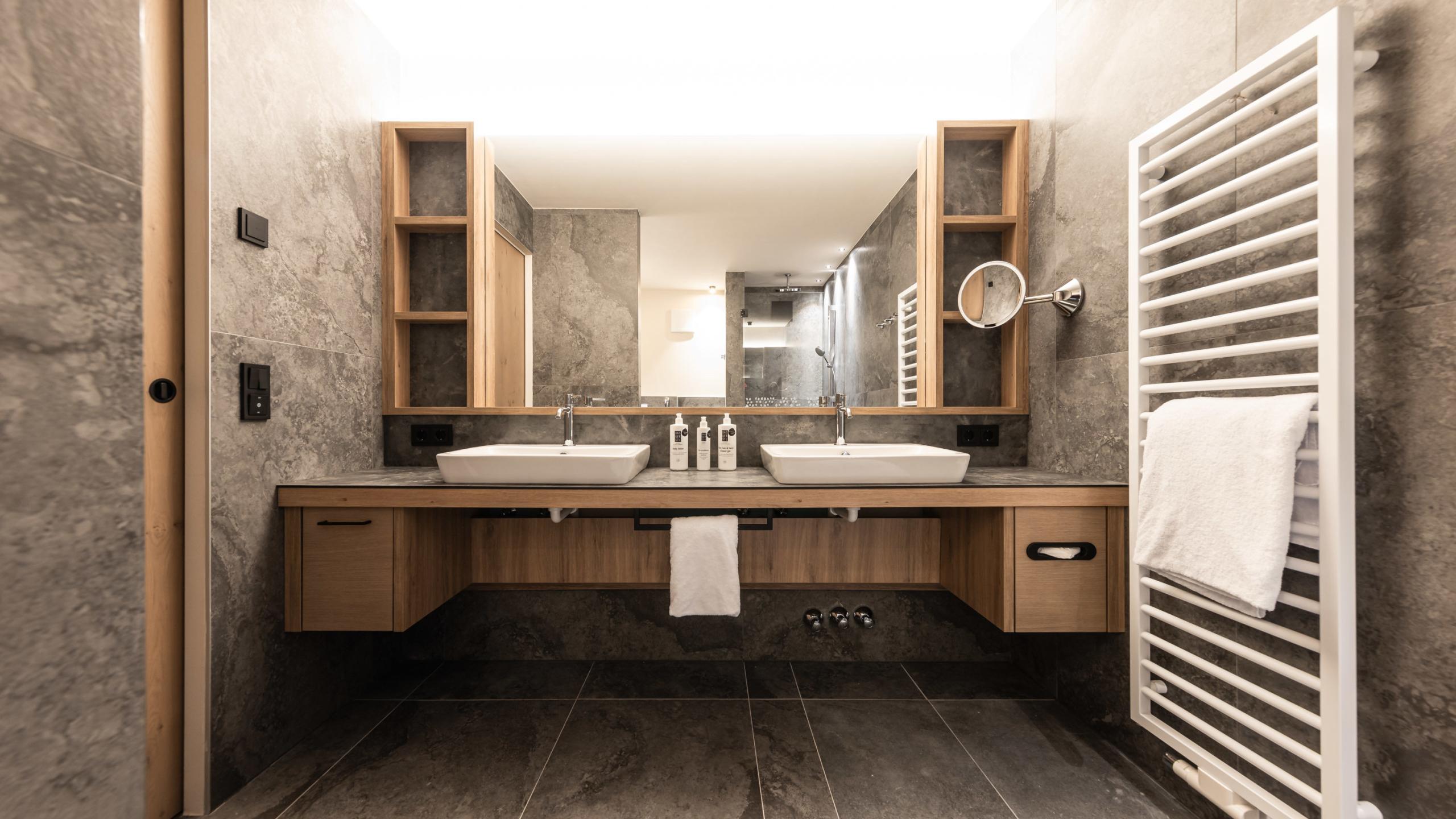 • Bagno con doccia a pioggia, doppio lavabo, WC parzialmente separato e bidet